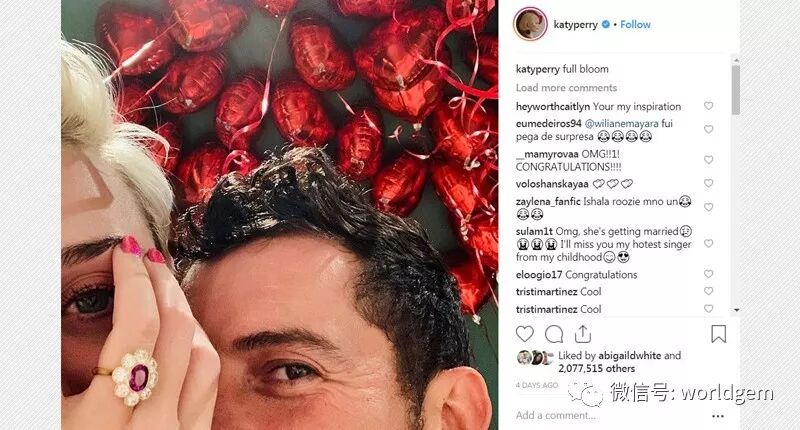 Katy Perry尚未透露这枚戒指的更多细节,但据E!Online消息称,这枚戒指的价格可能在500万美金左右。