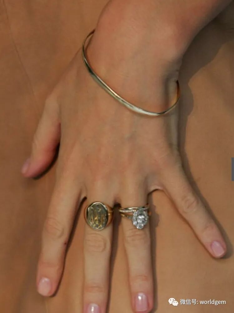 有消息称,Perry的戒指与Bloom向前妻求婚的那枚戒指很像。新郎前妻Miranda Kerr求婚时用的是一颗白色钻石,也有用到小钻石簇镶。