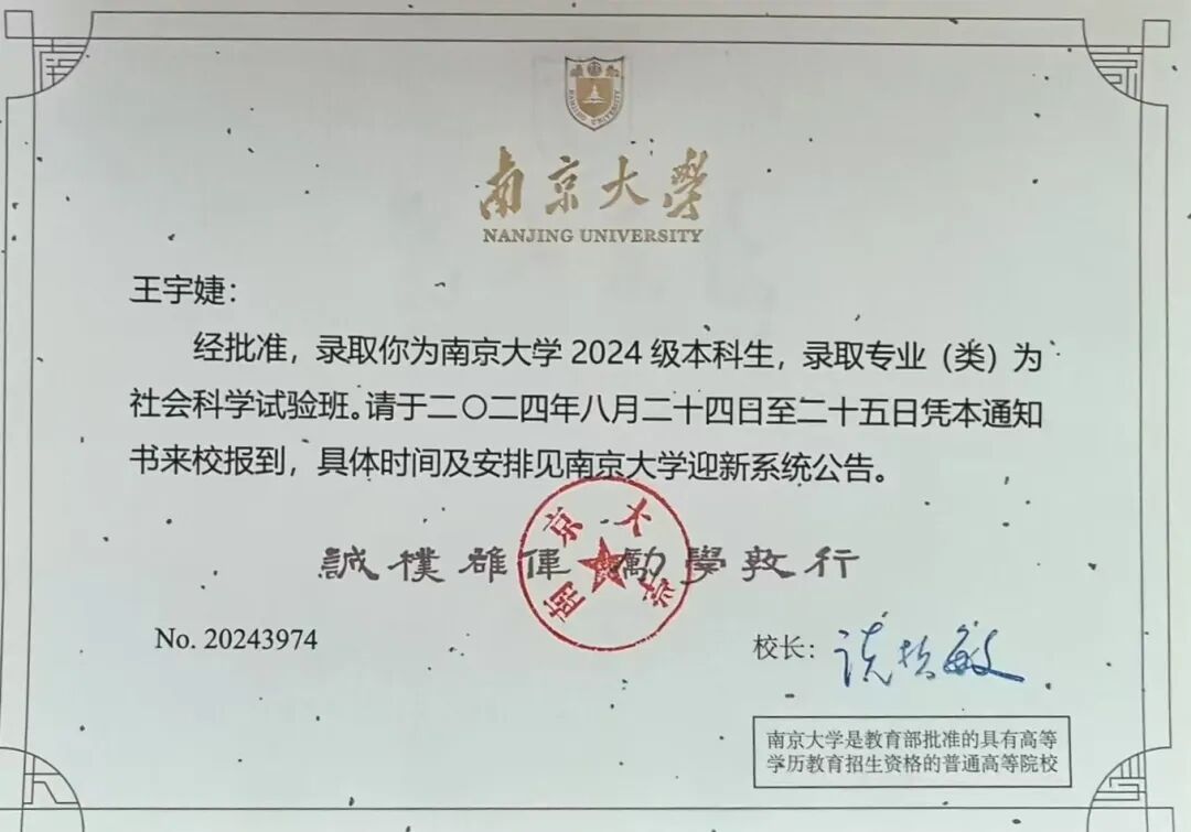 王宇婕,毕业于泾县中学2024届高三(4)班(历史方向),被南京大学(C9高校)录取,高考成绩658分,全省排名第126名,初中毕业于泾县千亩园学校。