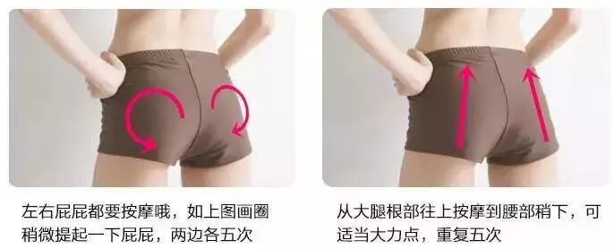 屁屁按摩也必不可少,紧致以外还可以提臀,按图下示意来回按摩5次即可。
