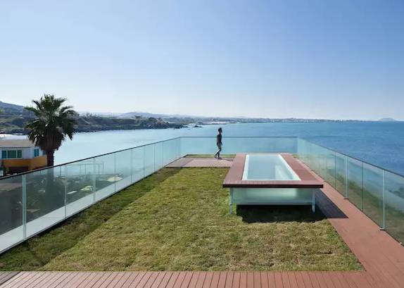整个咖啡馆的建筑主体主要以火山沙、海边岩石、废旧钢板及反光性能突出的大幅玻璃为主要建筑材料——入口及登上屋顶露台的过道围墙都由石头垒成。