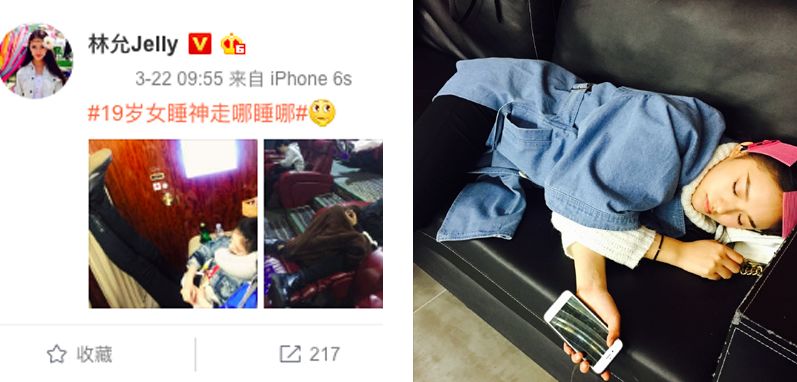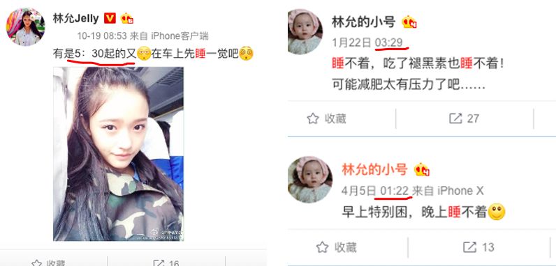 这就是典型的“倦容肌”,本乐翻了一下林允的微博,有很多抱怨睡得少的消息,甚至练就了一身走到哪睡哪的绝技~