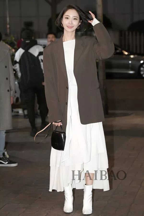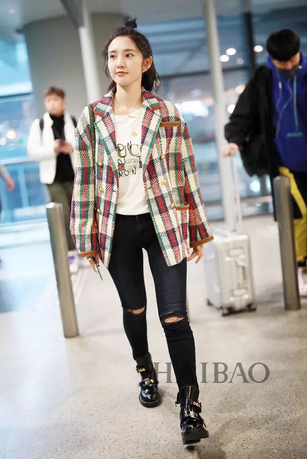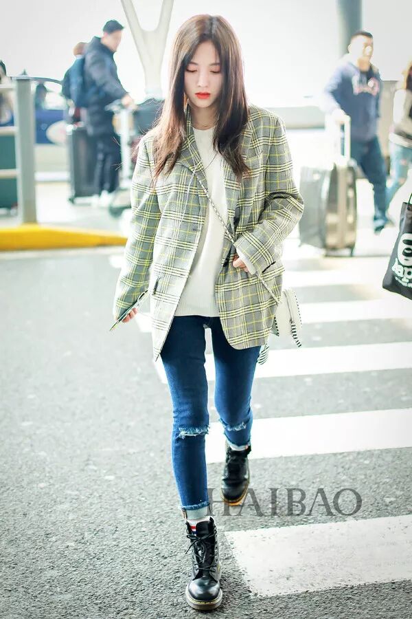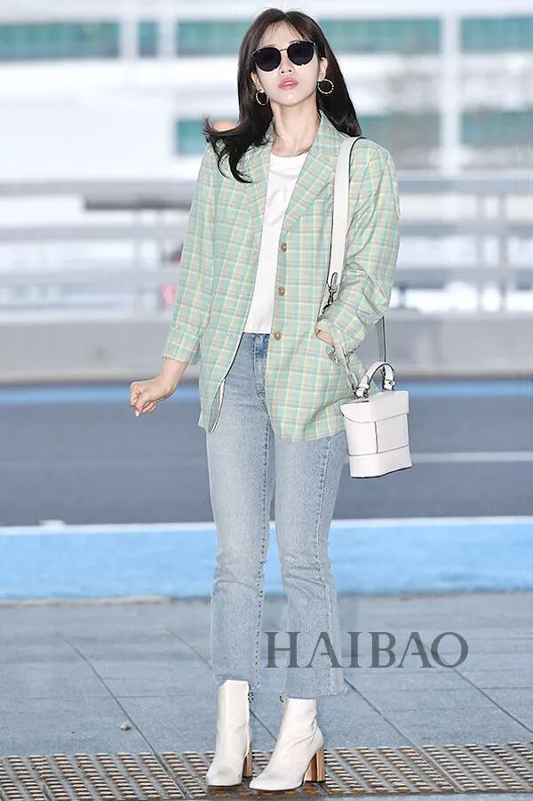 或者像咸殷晶这样选色彩小清新的格纹西装,甜美、帅气都是你~最后也别忘了,内搭要与鞋包做顺色呼应,显高作用很明显。