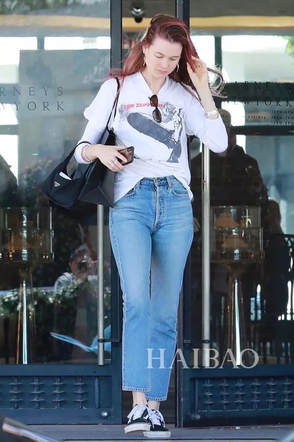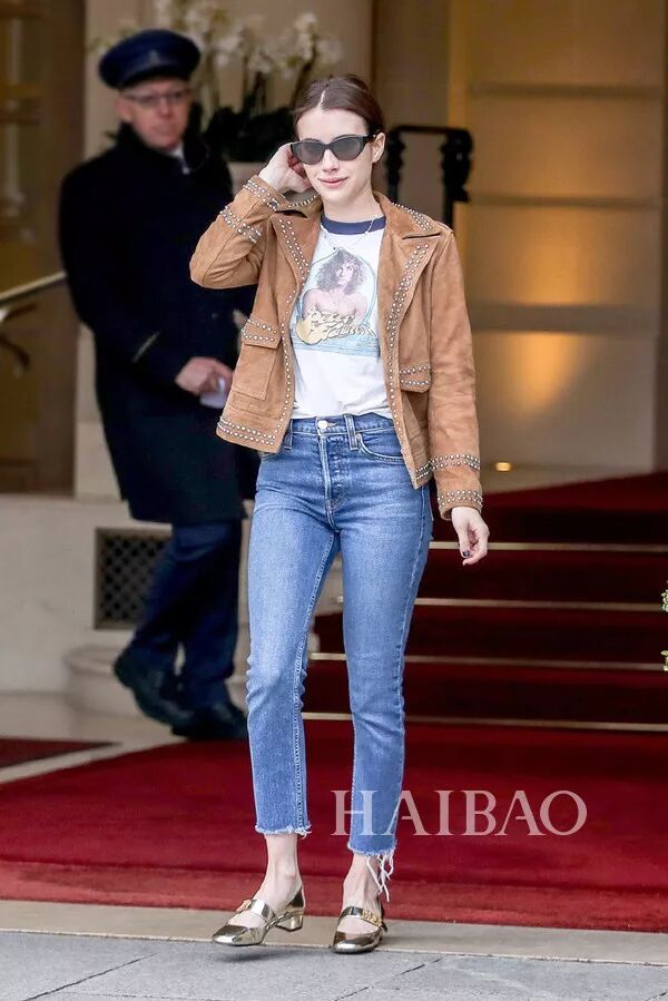 复古印花白T恤终于可以翻出来穿了,气温低的时候用它“打底”,基础搭配也能变得个性,Emma Roberts就是这样穿的。