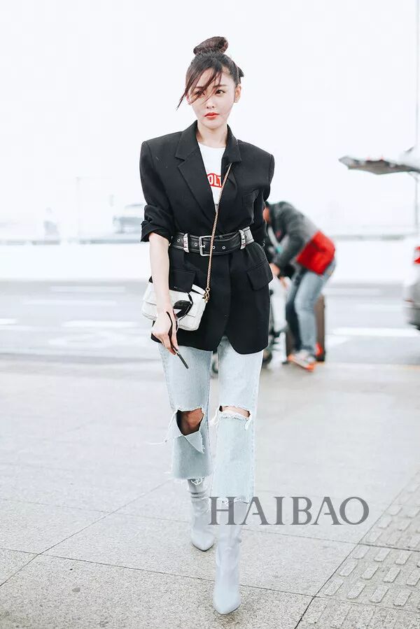 张天爱西服+腰带的穿法是你今年春天必须划的重点~裤鞋同色更显腿长。