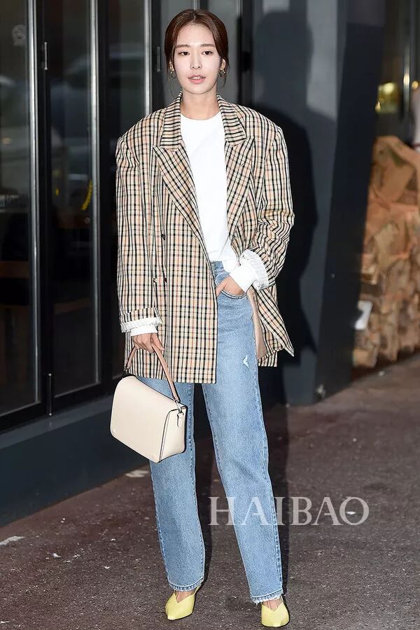 鞠婧祎、唐艺昕也穿了格纹“老爹西装”+牛仔裤这组春季必备时髦CP,上宽下紧的穿法最适合梨型身材啦!