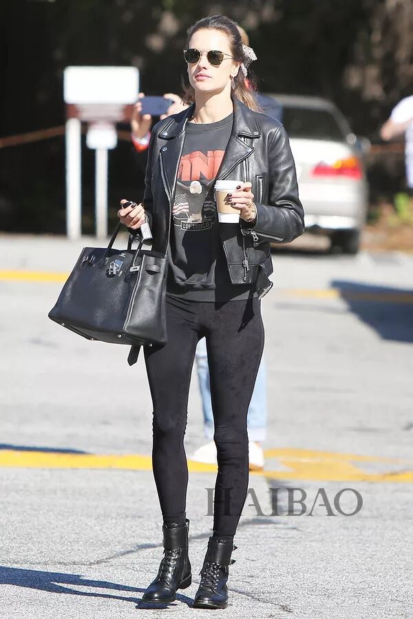 Alessandra Ambrosio最近也迷上了机车皮夹克,搭配卫衣、Legging,她是随性的酷女郎~