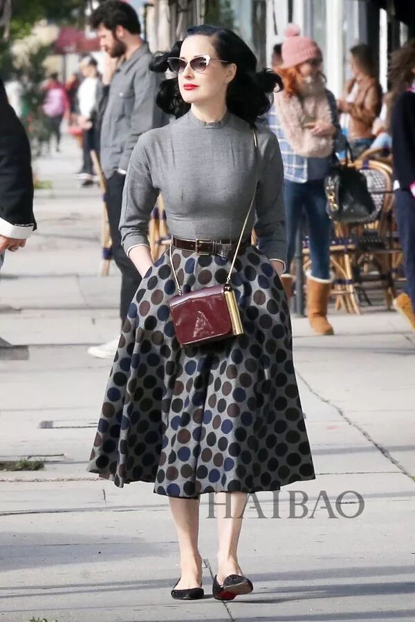 短上衣+A字半裙搭配是Dita Von Teese喜欢的40年代风格,挺括的伞裙有点圆,与尖头鞋才是“闺蜜”~