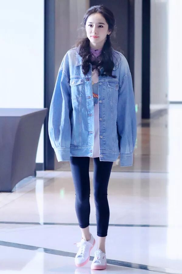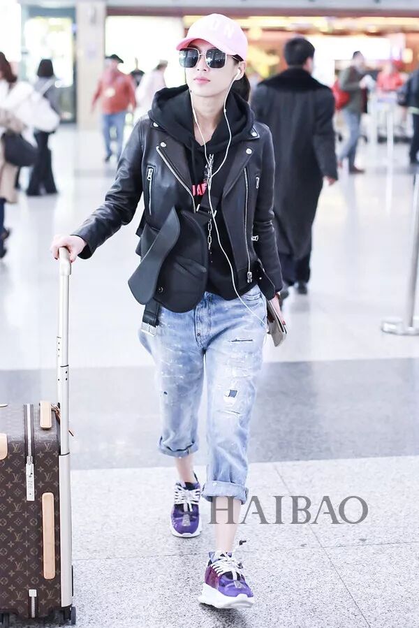 机车皮夹克“门槛”比较低,谁穿都能出气场~黄圣依用帽衫相搭就很好看,但裤子的长度太短了,容易显腿短,