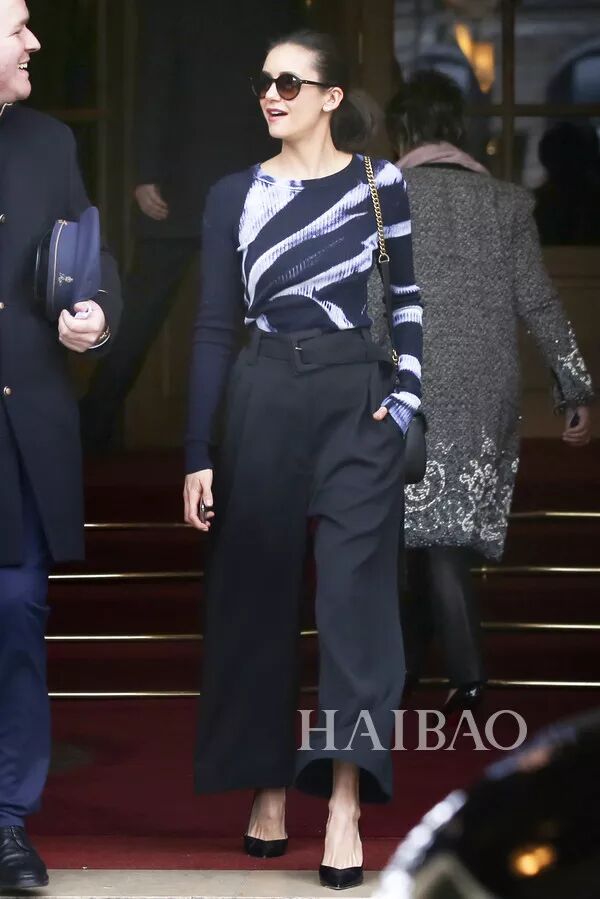 Nina Dobrev的印花针织衫+阔腿裤搭配也很美,这种穿法“梨型妹子”一定要Get,逐渐变宽的A字型裤腿,会让你的腰臀成为下半身最细的地方,绝对比任何裤型都显瘦。