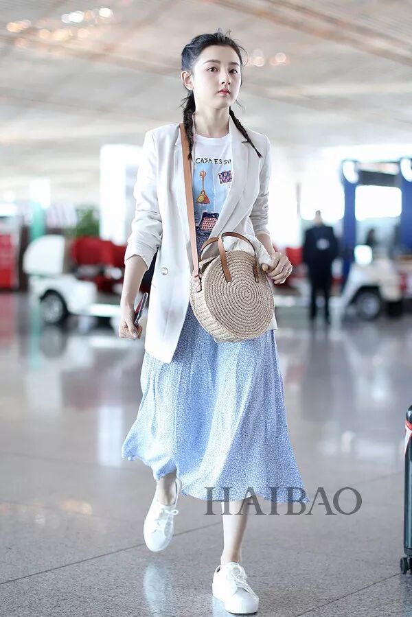 阳光灿烂的天气就穿西服+印花半裙,像宋祖儿这样梳着双麻花辫,挎个草编包,你就是元气少女本人。