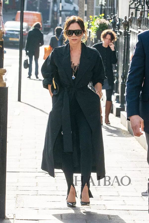 黑色风衣、蕾丝吊带上衣、紧身裤:Victoria Beckham