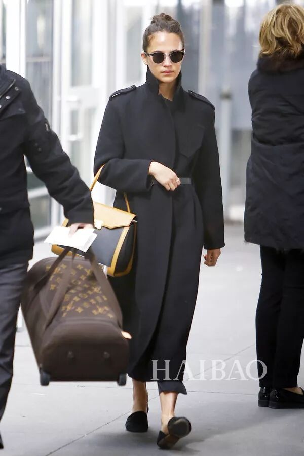 黑色大衣、风衣是“女神”必备的基础款,Alicia Vikander将枪驳领立起,绑上腰带,气场满格~
