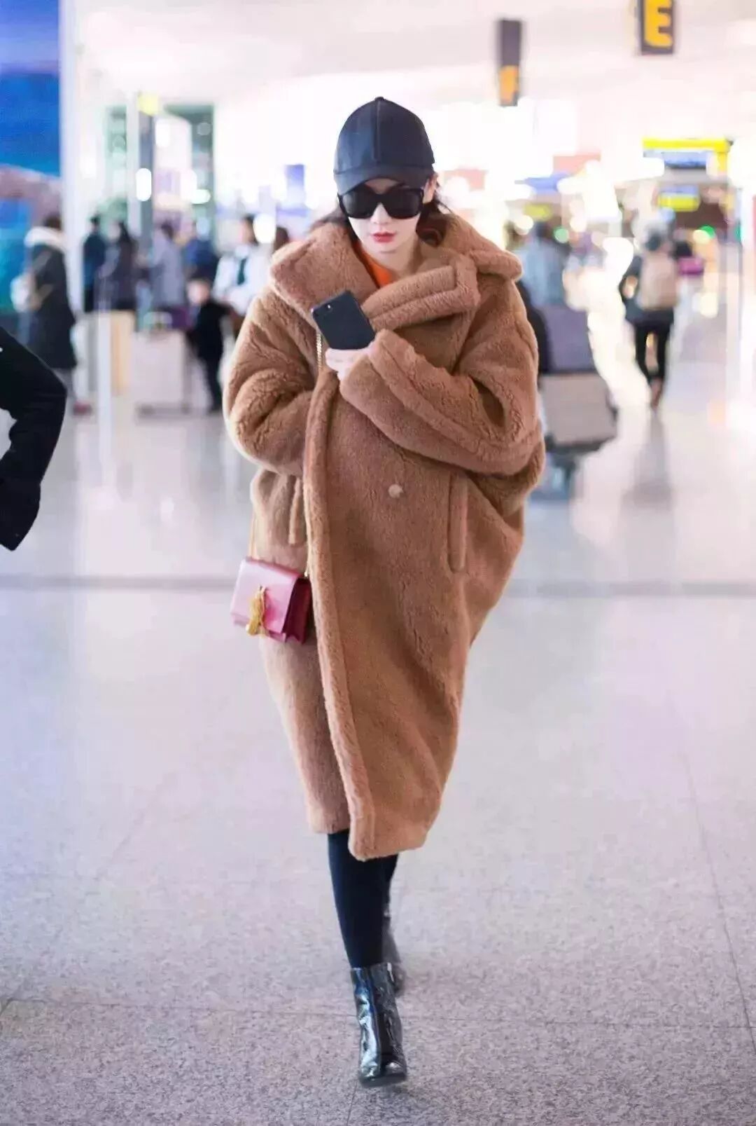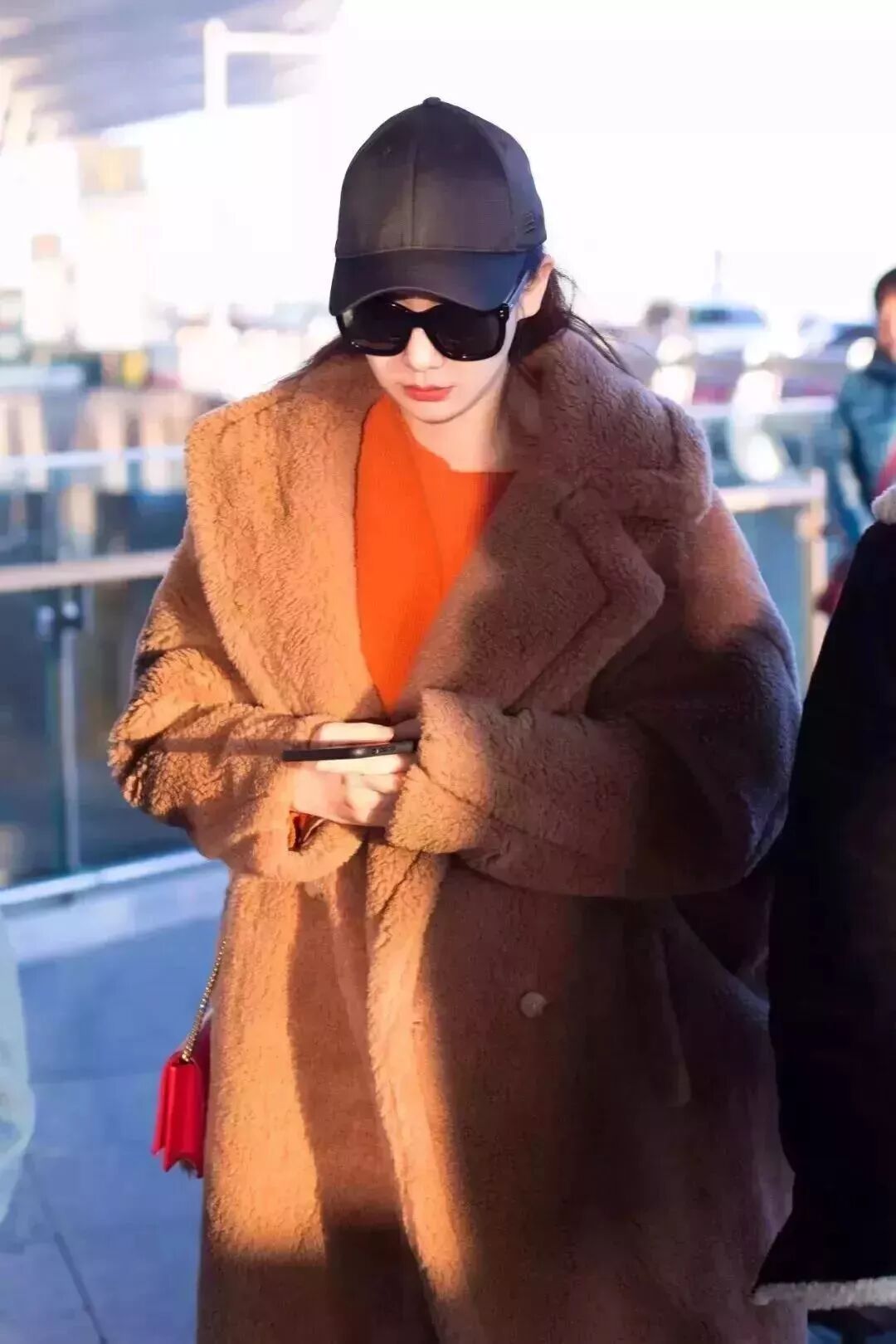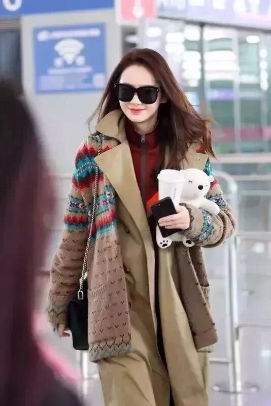 今年最火的泰迪熊大衣,戚薇用一件暖橘色针织衫搭配,看起来就有冬日暖阳的味道。