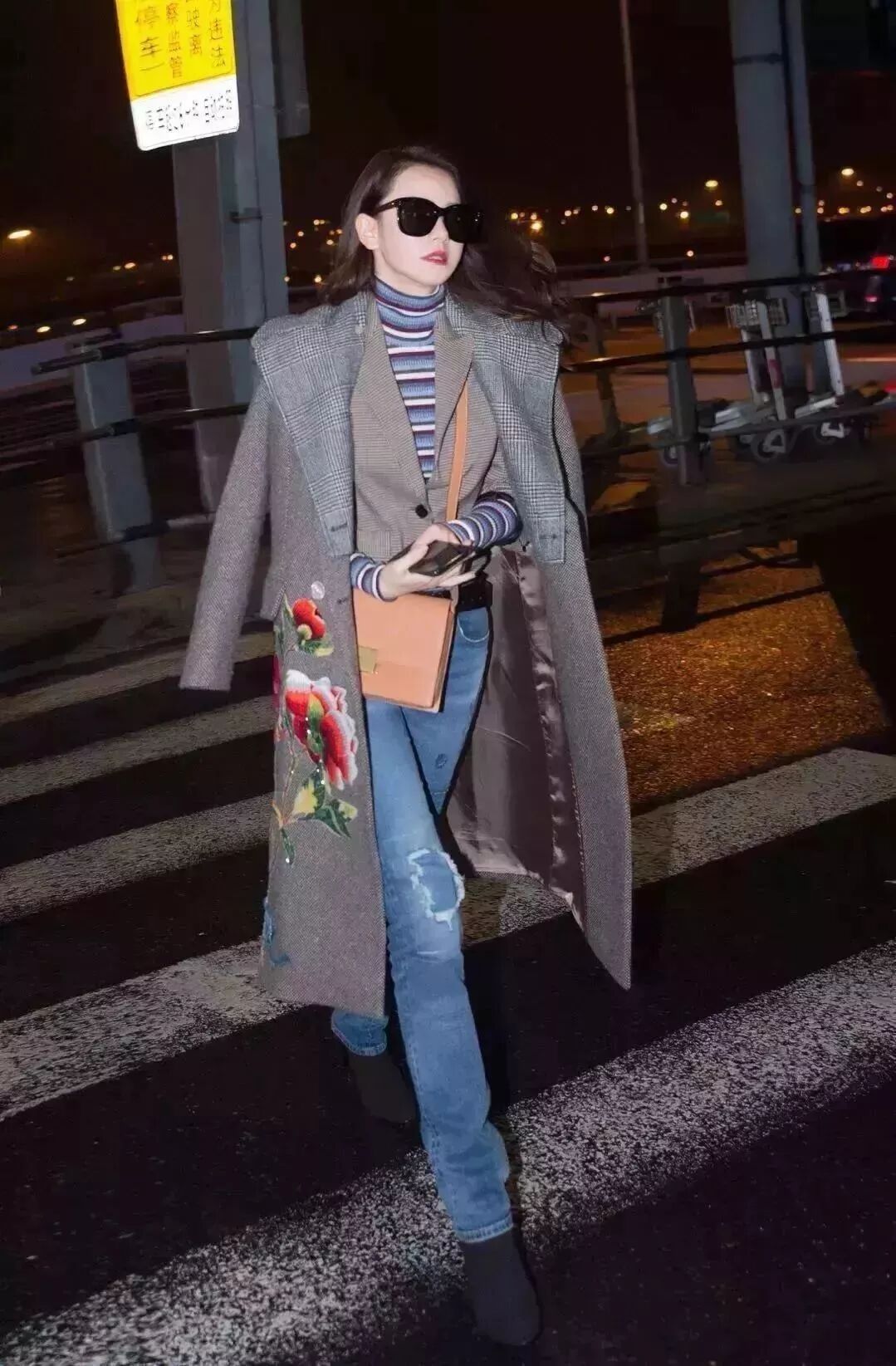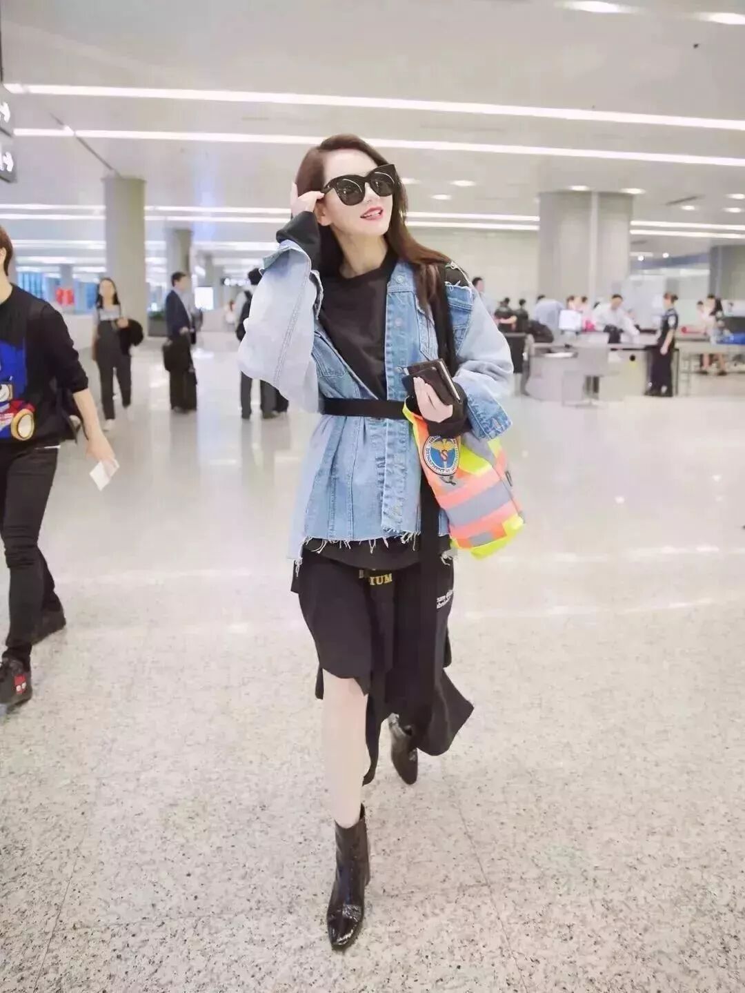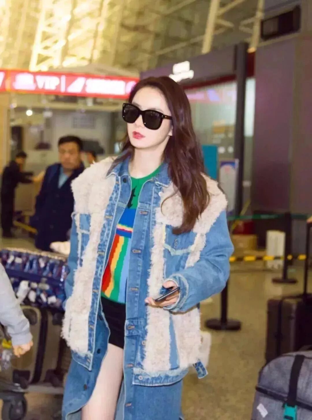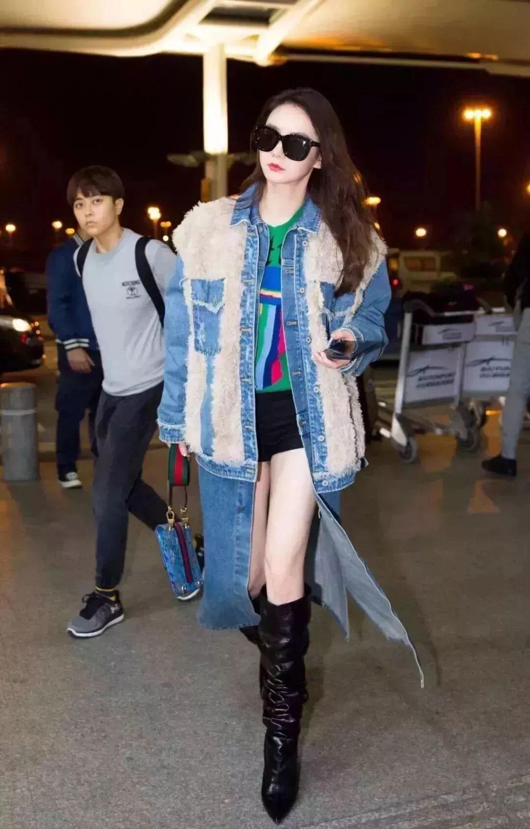 牛仔拼接羊羔毛外套,搭配黑色热裤。常人难以驾驭的堆堆靴被戚薇演绎得恰到好处。一副黑超让小姐姐明星气质显露无疑。