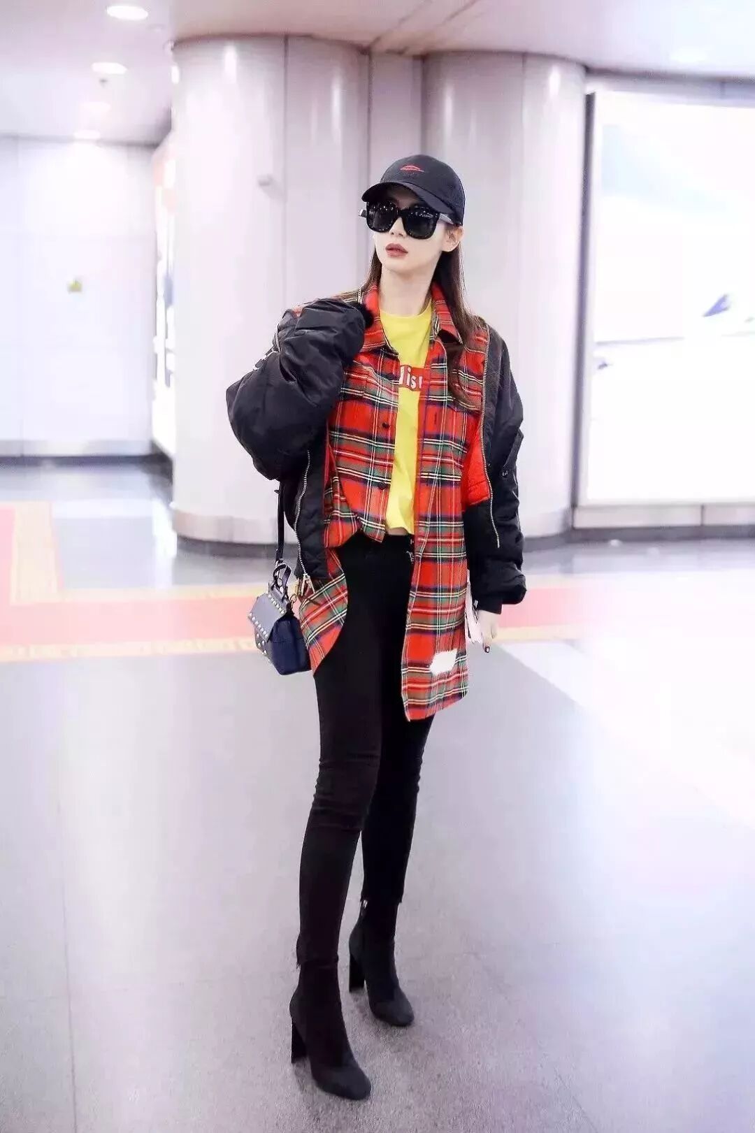 戚薇是个撞色和叠搭小能手,红格子衬衫撞色姜黄,外穿一件飞行员外套,帅气又鲜明。