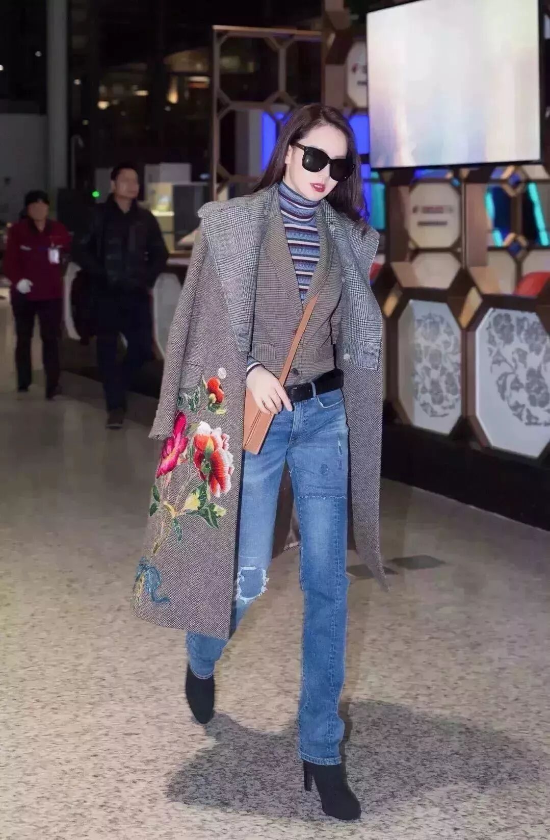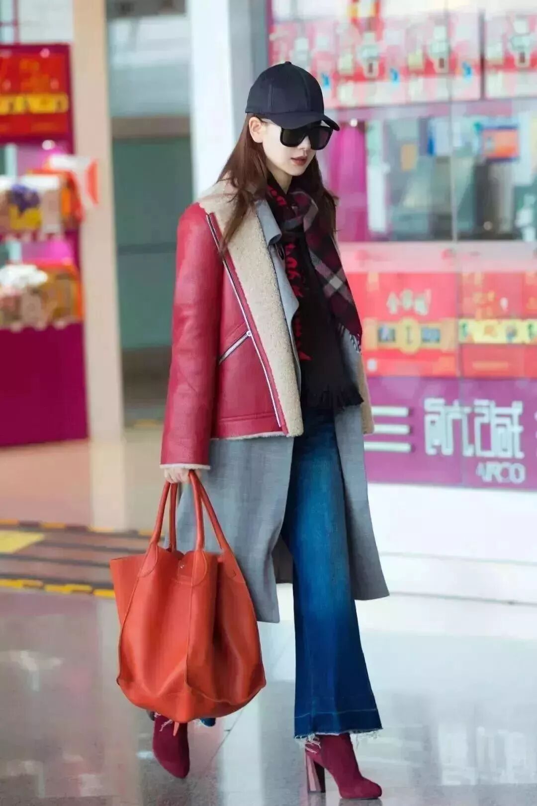 酒红色皮毛外套,内搭一件长款烟灰色衬衫,牛仔阔腿裤与酒红色高跟鞋,这么多元素加在一起非但不违和,还有满满的复古感。