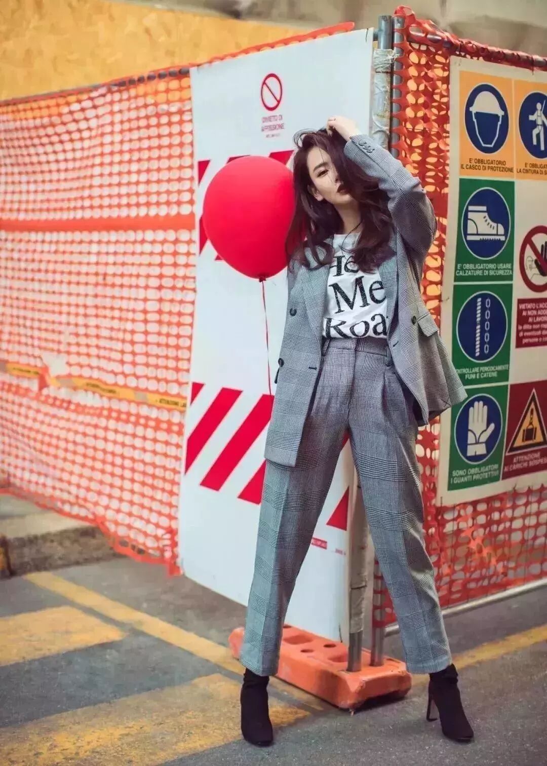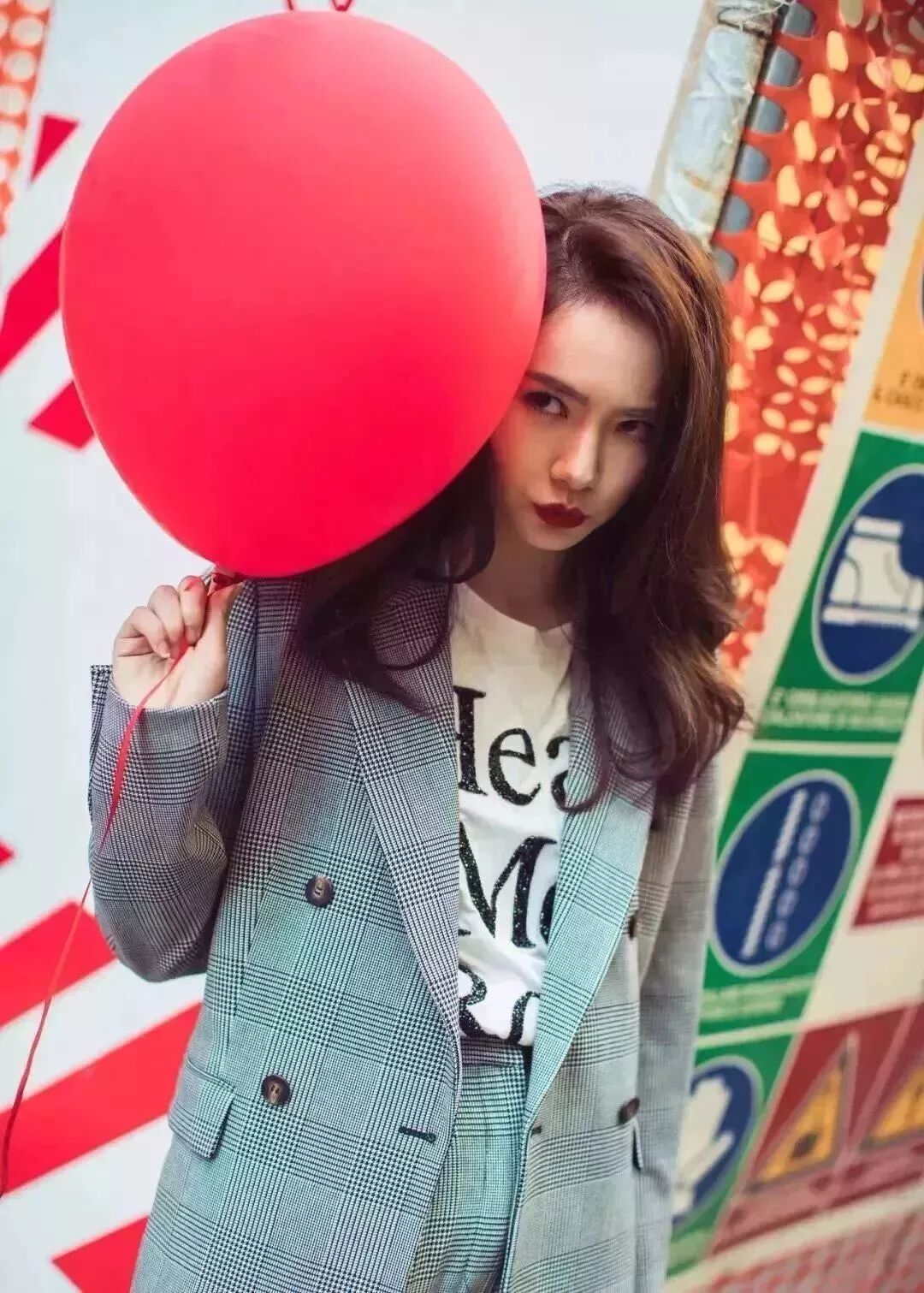 今年大火的格纹西装,戚薇选择了全套,内搭一件再简单不过的白色slogan tee,简约复古feel就这样出来了。
