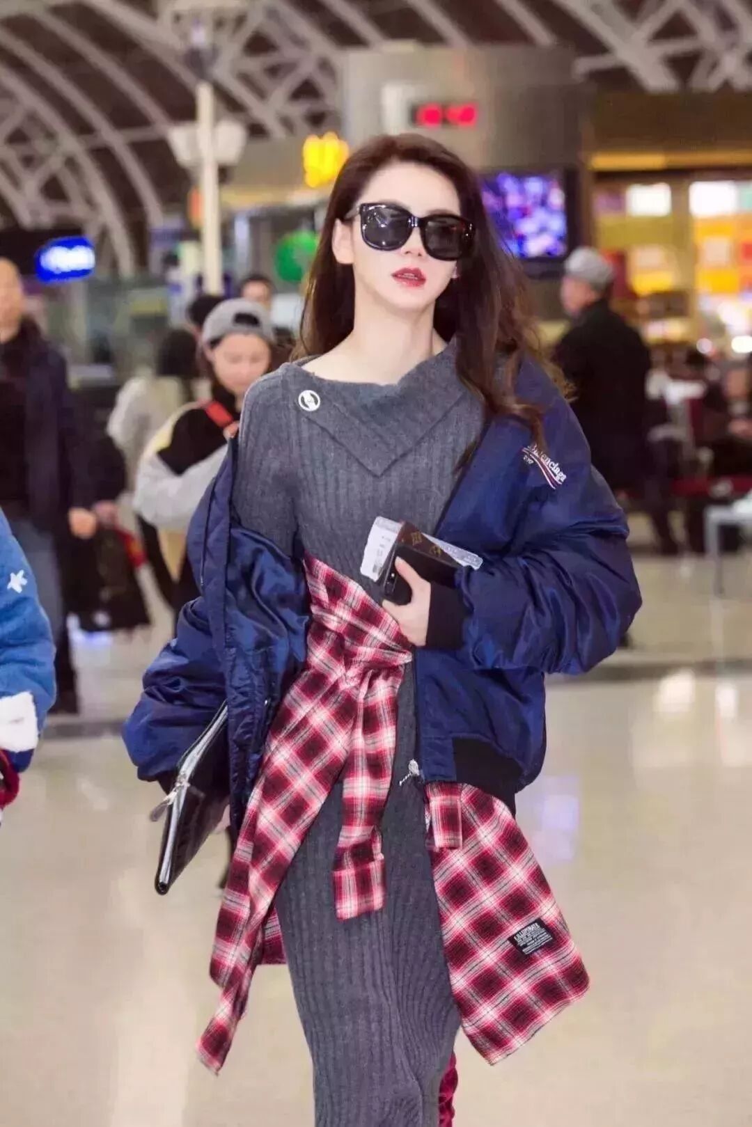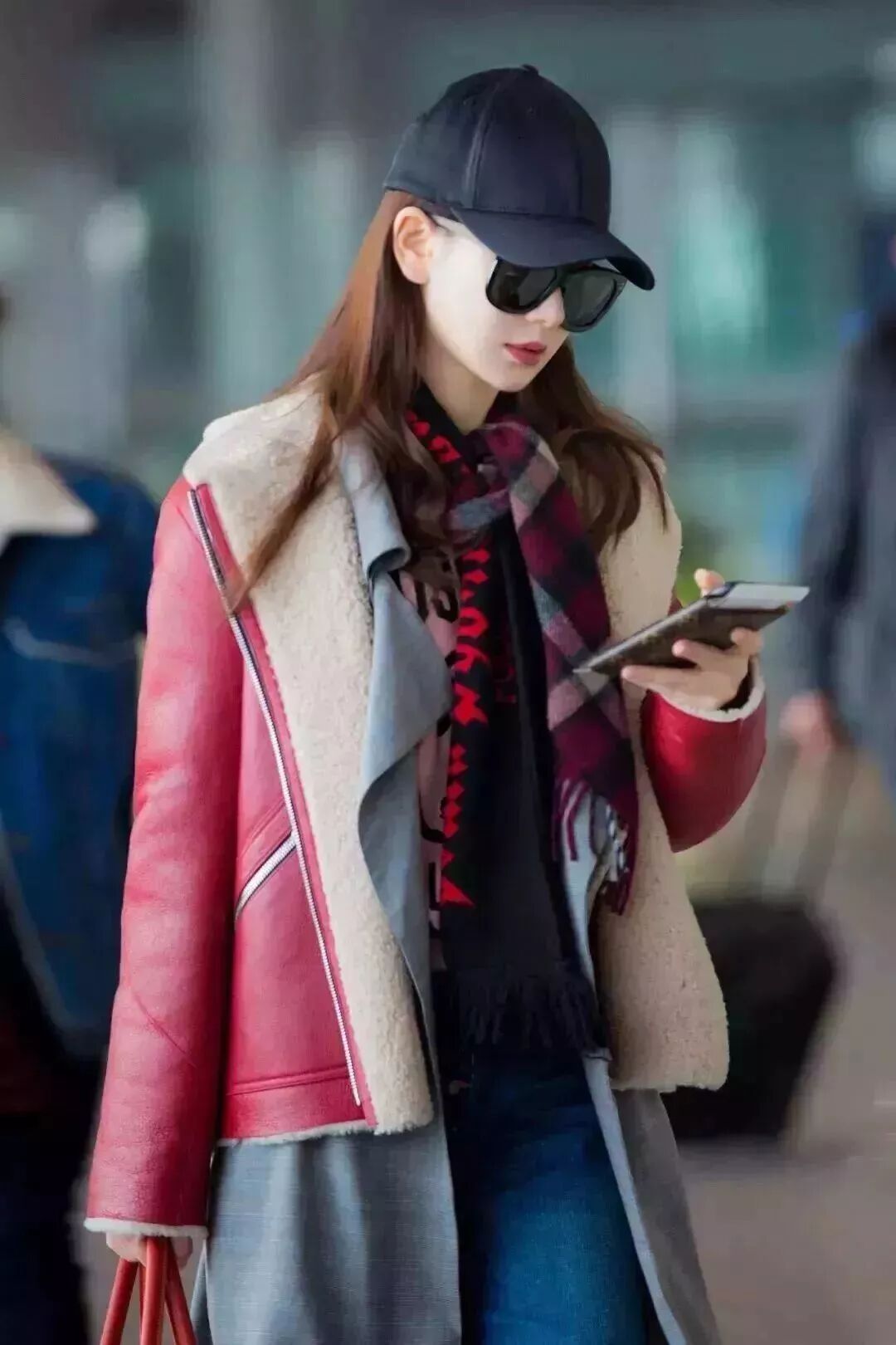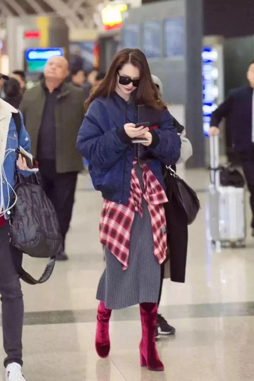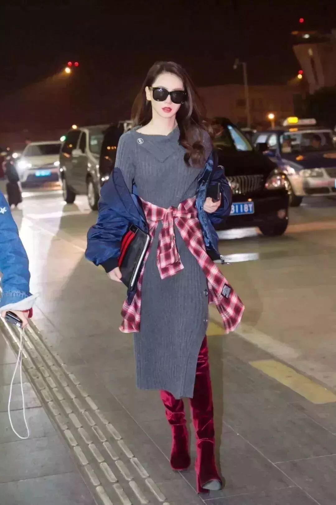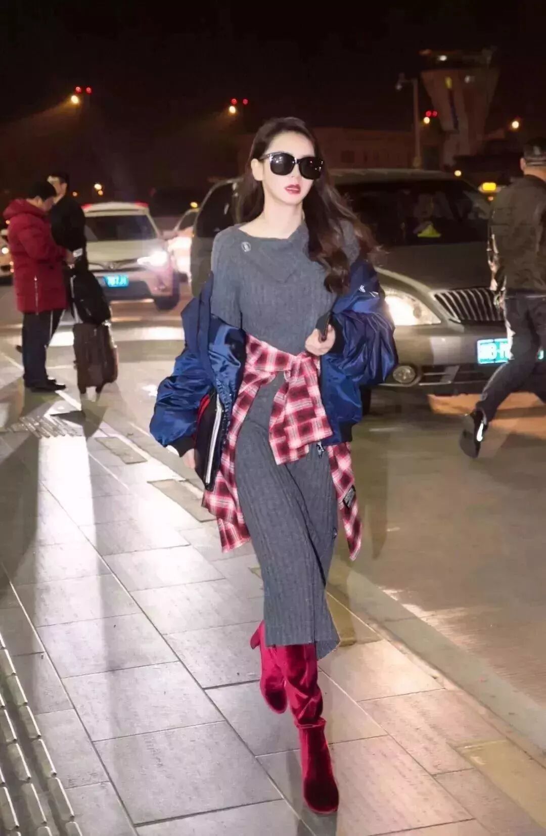 针织长裙和酒红色丝绒过膝靴这样的组合看起来八竿子打不着,但是戚薇聪明地在腰间加了一件红格子衬衫做腰带,不仅强调出了腰线还让主色调更鲜明。一件藏蓝色外套和红色组成cp组合,撞色也玩得贼6。