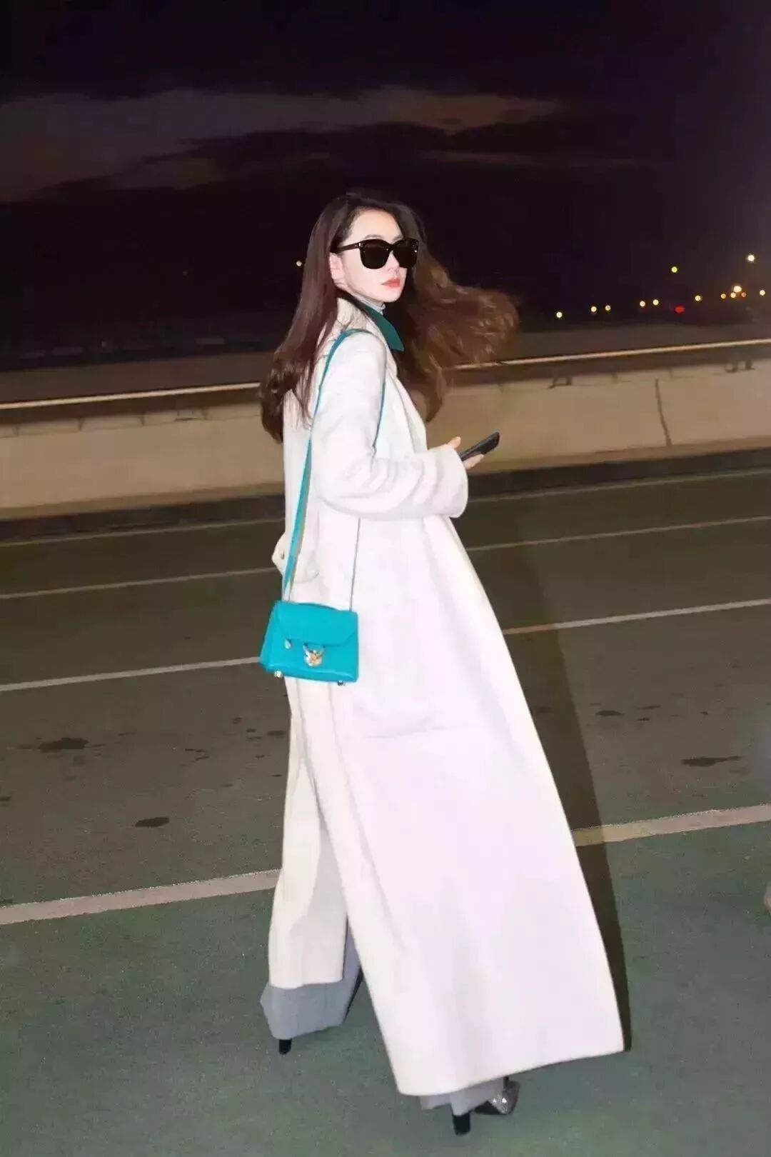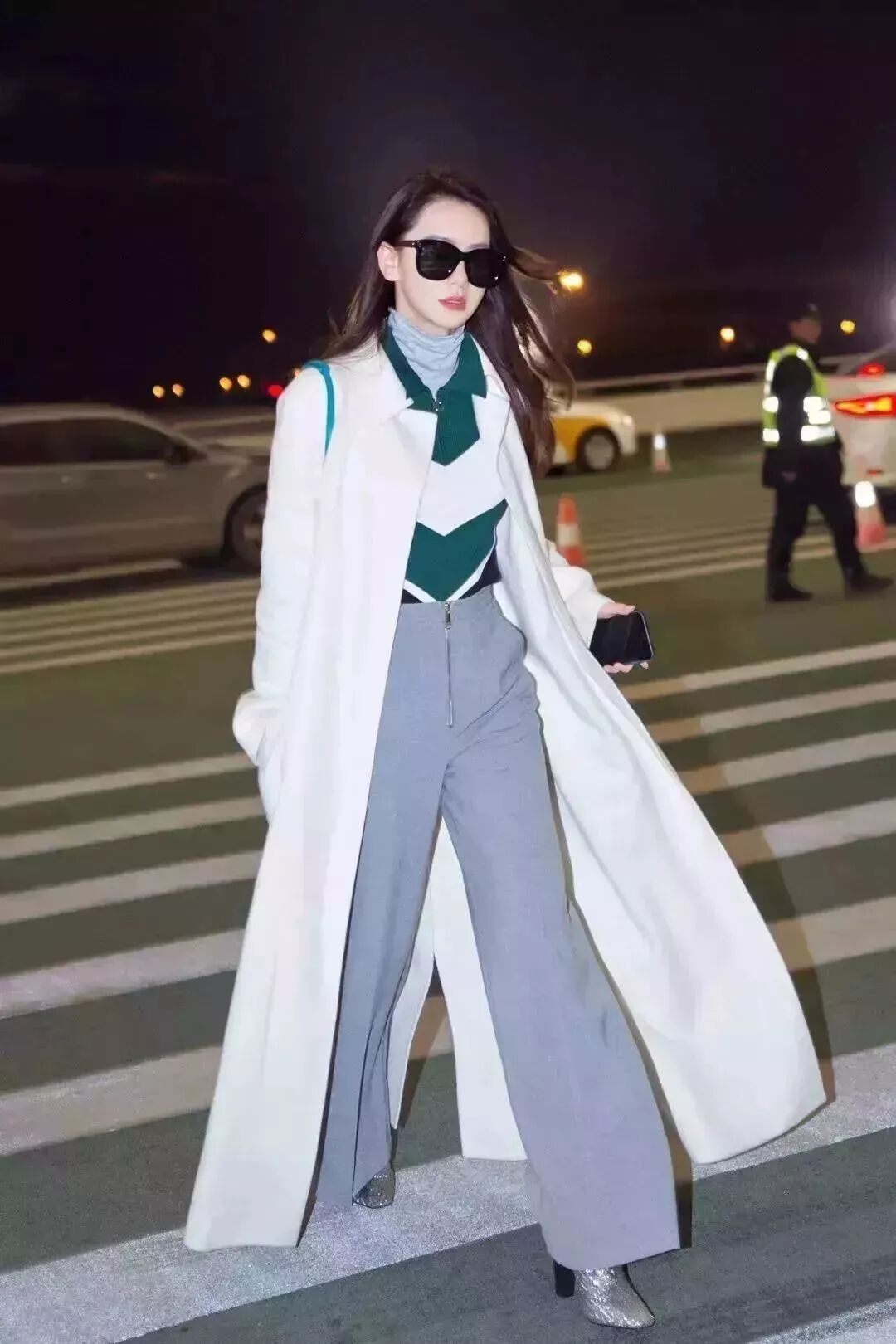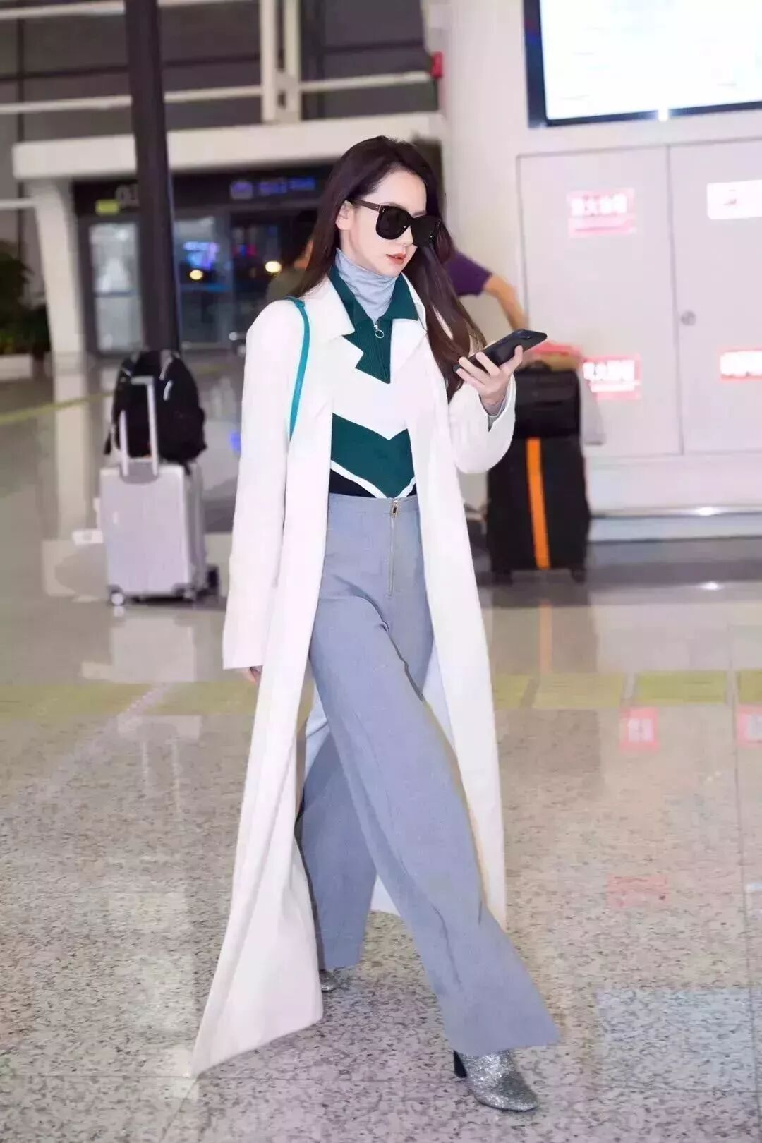 纯白色长大衣内搭烟灰色高领和墨绿色校园风拉链卫衣,下面搭配一条超长烟灰色阔腿裤,气场一米八。一只绿色的包包点亮全身,非常优秀。