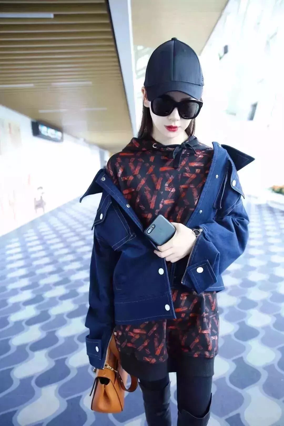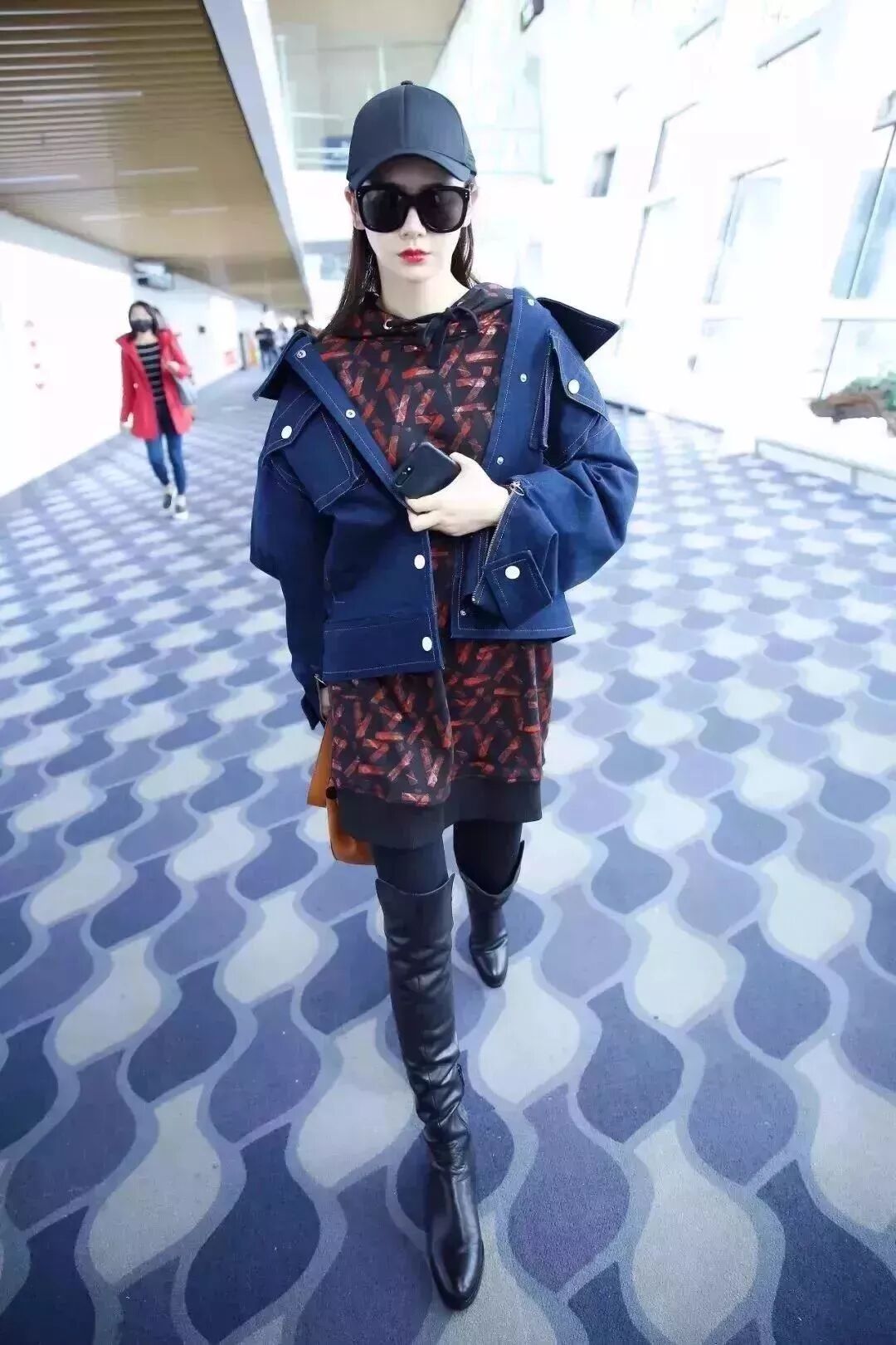 藏蓝色牛仔外套搭配暗红印花卫衣裙,一双黑色过膝靴气场十足。黑色棒球帽为整体look添了几分帅气,“不好好穿衣大法”看起来非常有范儿~