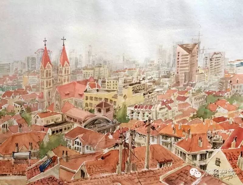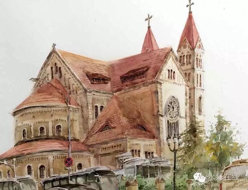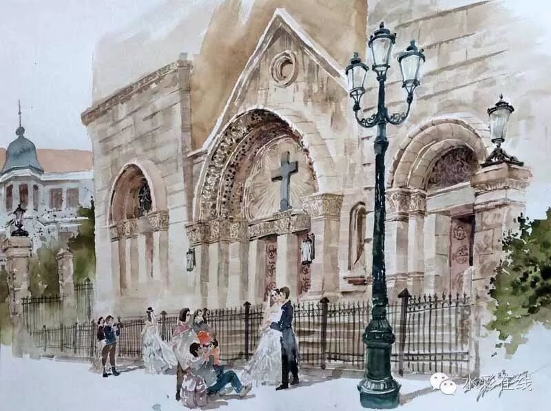 《阳光灿烂的青岛天主教堂前的新人们》61×46(cm)