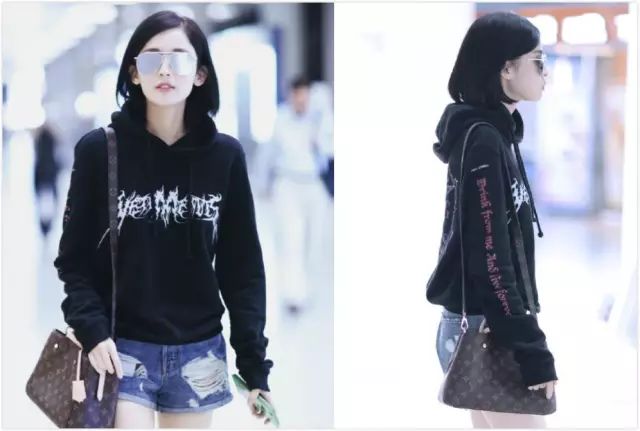 机场look,简单随意的卫衣搭配牛仔短裤,短发造型也很抢镜。
