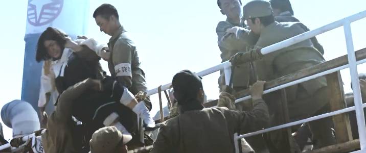 一堆日本兵冲上还未靠岸的客船,乱糟糟地冲着满船朝鲜人拳打脚踢,强行把船上男女分开。