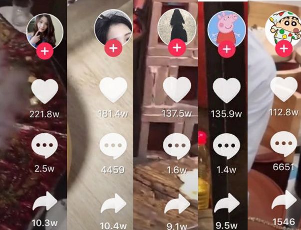 使用《我要吃肉肉》背景音乐,排名前五的抖音UP主的点赞率就已经达到近800万。