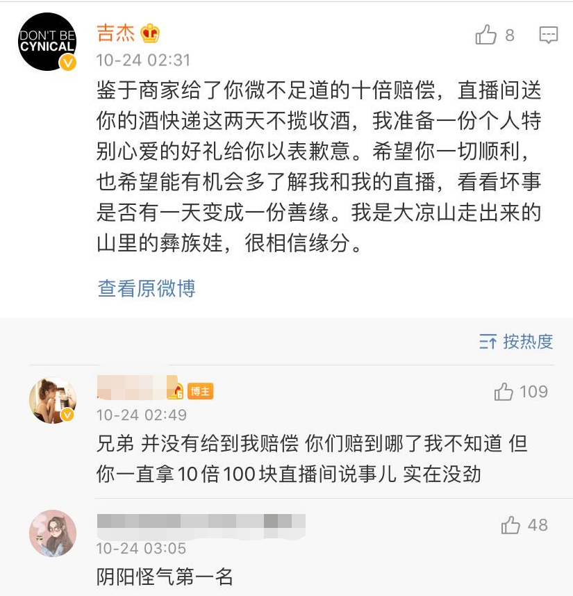 这一系列话当然激起了更大的不满,网友甚至质疑吉杰,消费者连说实话的权益都没有了吗?还是挡住了捞金的财路?