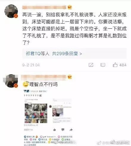 这个网红也是丝毫不示弱,反怼粉丝是脑残粉,说自己并没有不礼貌,床垫有可能是上一届留下的,真是有洁癖也可以扔掉!而自己也没有蹭热度。