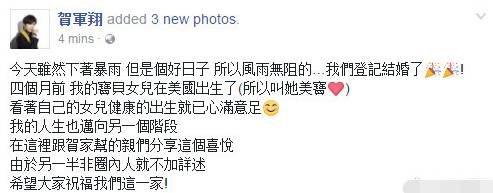 贺军翔今日突然在脸书宣布自己结婚了,并且女儿四个月前在美国出生,小名“美宝”。而好消息他也更愿意分享给粉丝,而非其他人:“看着自己的女儿健康的出生就已心满意足,我的人生也迈向另一个阶段,在这里跟贺家帮的亲们分享这个喜悦,由于另一半非圈内人就不加详述,希望大家祝福我们这一家。”↓