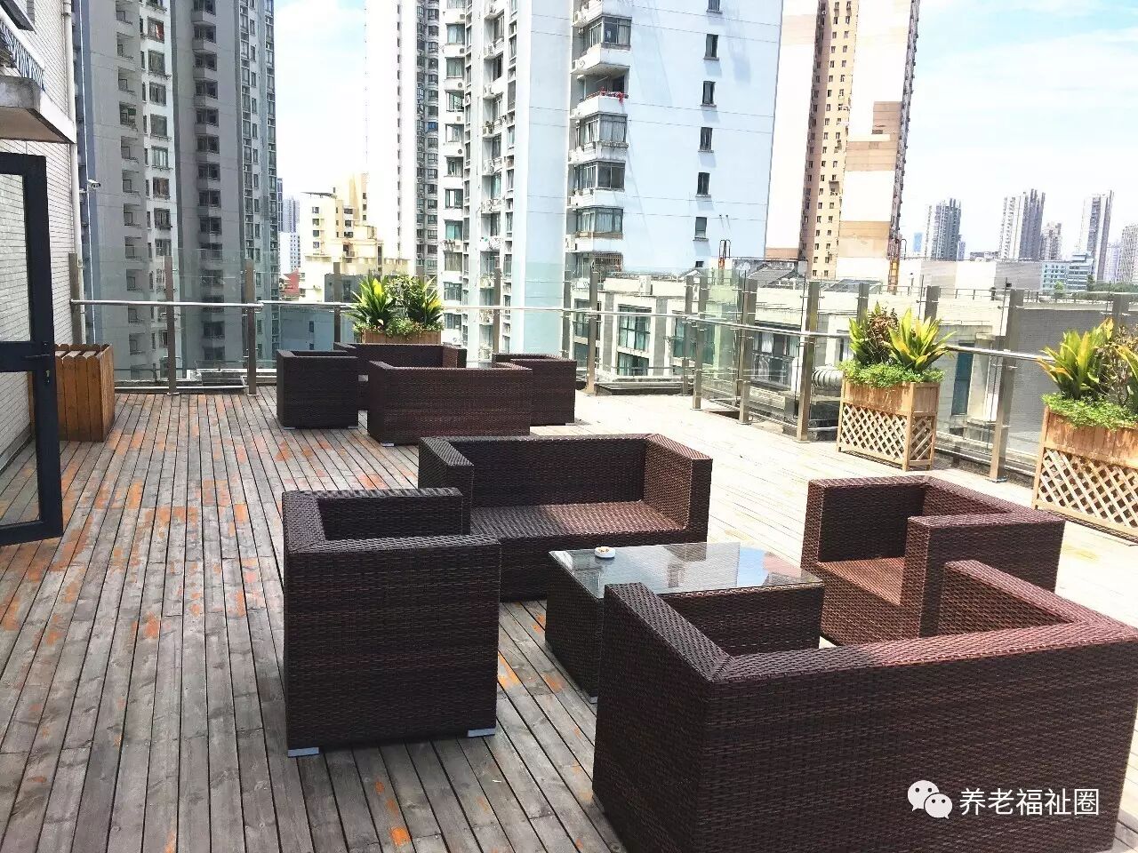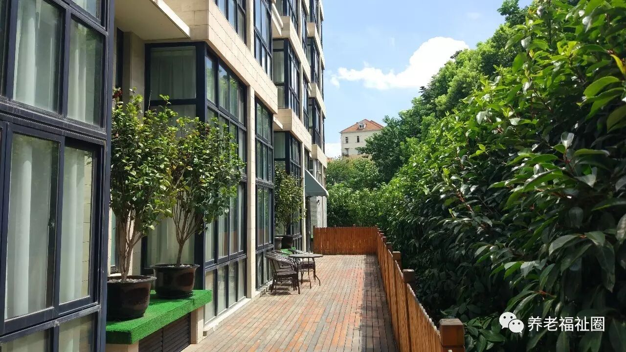 院方在一楼贴心的开辟了一个露台,打开门,老人们就可以面对郁郁葱葱的一片绿色,悠闲的晒晒太阳,不时有小鸟叽叽喳喳的叫声~▼