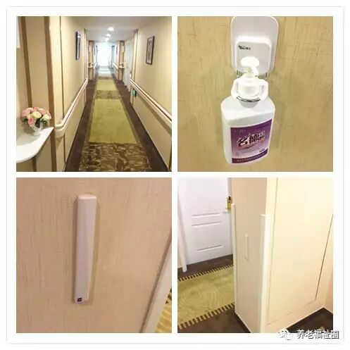 再来看一下过道:两边都是扶手,铺着厚厚的地毯;干洗手液;门框包边放置撞伤;罗格朗监测机器(通过监测老人们佩戴的手环,可以准确的了解到老人们每天的行动轨迹;如果有失智老人,如果他/她不慎走出了安全区域,会进行报警)。▼