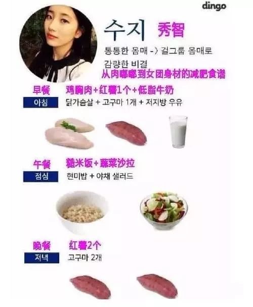 首先看看她的食谱,早餐:鸡胸肉+红薯+牛奶。午餐:糙米饭+蔬菜沙拉。晚餐:红薯2个。看上去还挺健康的。