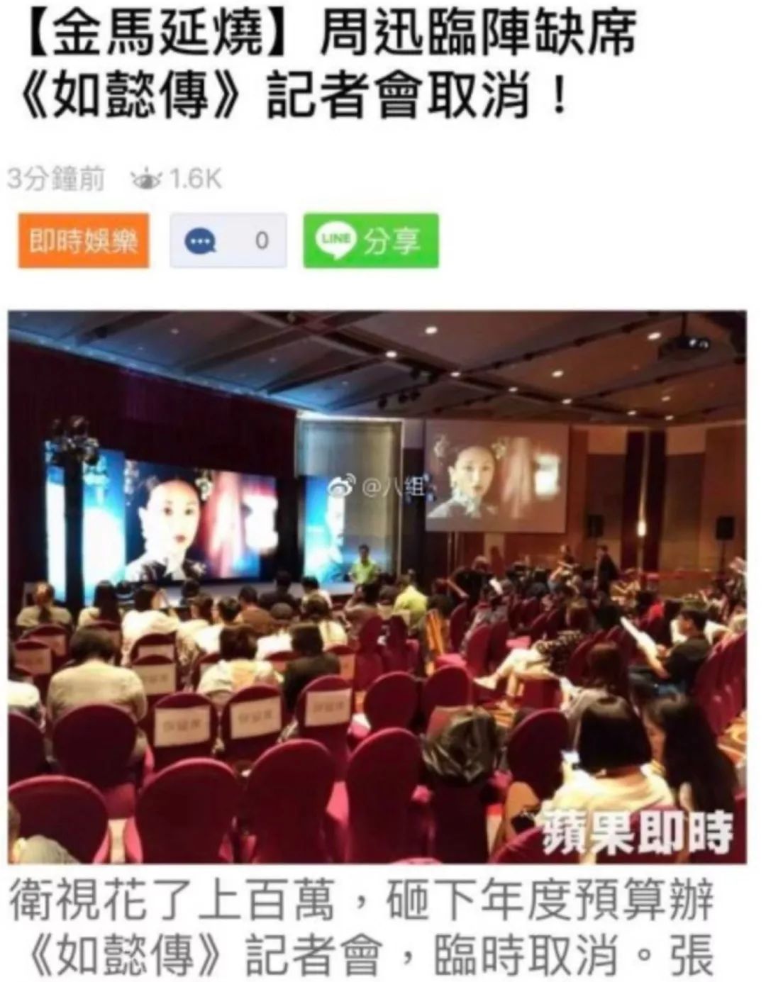 而周迅今天“因故”不能出席《如懿传》发布会,《如懿传》台湾发布会也因此临时取消。