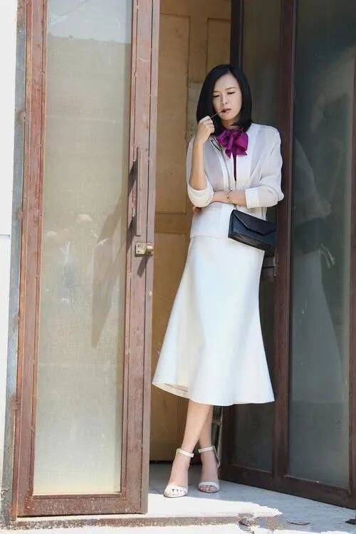 李艾一身纯白色礼服优雅大方长发披肩,不仅仅的身材高挑,一米八的即视感简直让人羡慕,而且还有一种清纯优雅的气质,不过搭配着紫色的领结真的是有点失败了呀!本来还挺年轻的,穿搭瞬间老气了不少,也太可惜了呢。