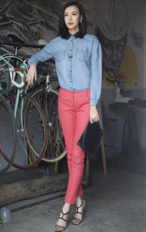 李艾休闲服的时候可爱甜美,一身精致穿搭也是女强人的感觉呢。水红色的休闲长裤搭配着高跟鞋,知性优雅还显腿长也是非常nice了,不过搭配着蓝色牛仔上衣却有种撞色严重而且混搭的感觉。能够驾驭的住也是多亏李艾的气质颜值高啊!
