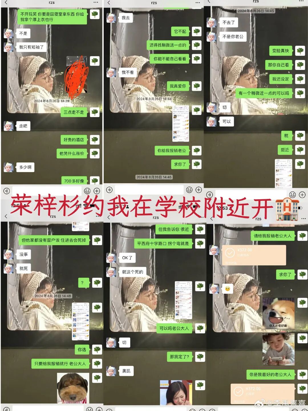 而在这些聊天记录中网友发现,两人曾在中戏校外开房,房费为372元,由李禹熹先行支付,在李禹熹“老公大人”的称呼下,荣梓杉将房费转给李禹熹。而在两人发生矛盾后,荣梓杉甚至曾用李禹熹私密照片当小号头像。