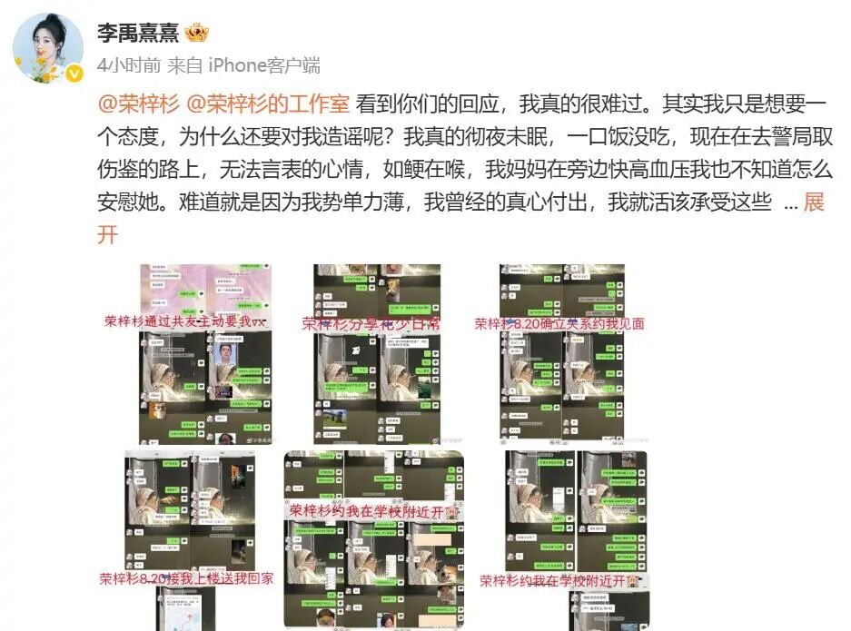 10月15日晚,今年刚从中央戏剧学院毕业,也是荣梓杉师姐的23岁女孩李禹熹发文要求荣梓杉就两人恋爱期间劈腿、打人等行为道歉。