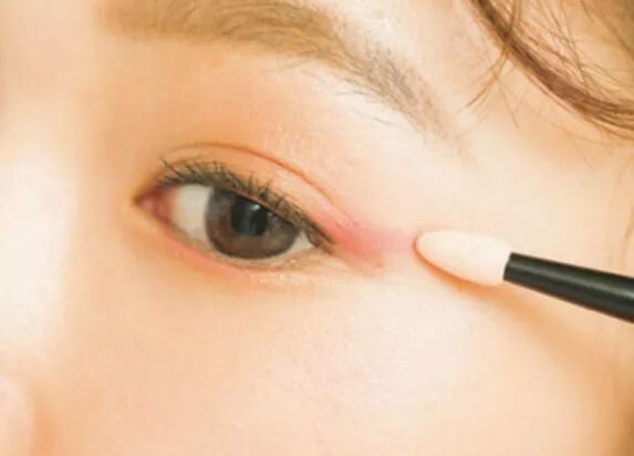 然后用沾取了有色润唇膏的眼影棒在外眼角处,代替眼影画出一个小三角,然后再沾取一次有色润唇膏涂抹在下眼睑。
