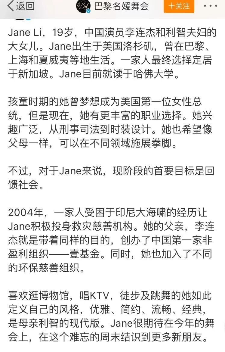 在巴黎名媛舞会的官方介绍词里,也介绍了Jane Li目前就读于哈佛大学,名校学历也是一大加分项。