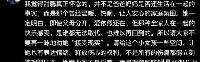 这种狗血的"初恋情人+复合猜疑"轰动效应,不免让已成年的甜馨想起了父母的离婚历程,加重了她对完整家庭的怀念和渴望。"父母的离婚,最大的受害者就是孩子","孩子永远是无辜的","小孩子最需要的是完整、幸福、温馨的家庭环境"……网友们纷纷为甜馨的处境感到心疼不已。