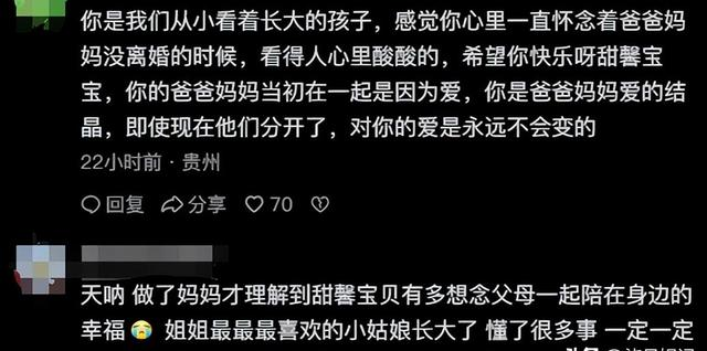 对比如今的现实,甜馨内心不免酸涩难过。原本的幸福美满家庭,就这样支离破碎。她不得不在6岁那年,就被父母离婚这个现实狠狠击中。"再多钱也买不到这种美好"、"钱能买来很多,但无法买来一个完整的家"、"我心都碎了"……看到这句9字心酸文案,网友纷纷感叹起亲情的珍贵。
