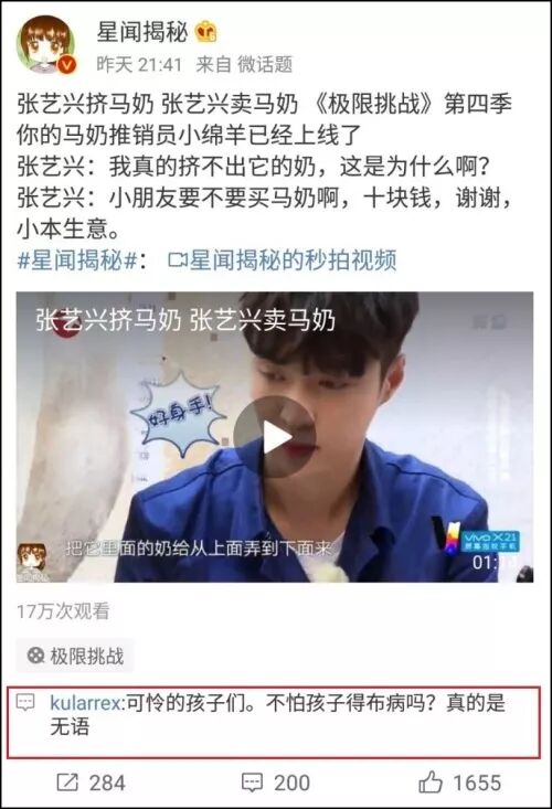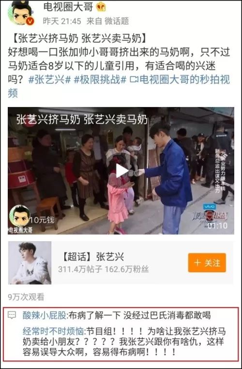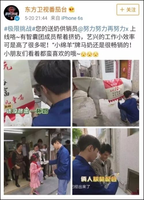 因此在昨晚《极限挑战》节目播出后,@奶粉揭秘 再次提出批评,认为节目组事前没有做足功课,安排节目嘉宾做现挤马奶售卖的任务完全是“反智”,也容易误导观众。