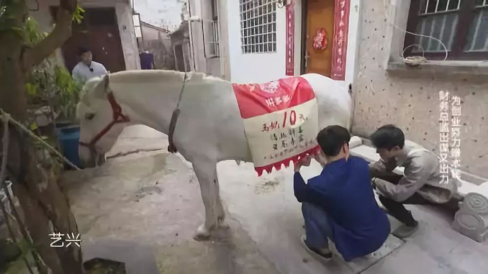 可以明显注意到,马的身上还挂了一块布,我们来看看写了什么?近景特写,大致是“清热解毒,营养丰富,适合8岁以下儿童喝”。