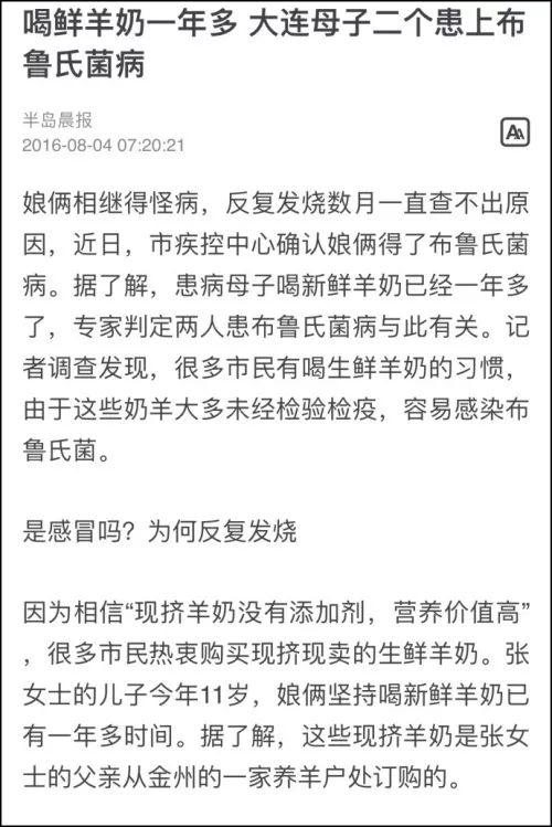 若疏忽这些,才出羊圈就上餐桌的鲜奶,或不远迢迢网购的私家羊奶牛奶,看似抢到“鲜”机,病从口入的风险也大大提高了,免疫力较差的小朋友、老人和孕妇需要慎重尝鲜。