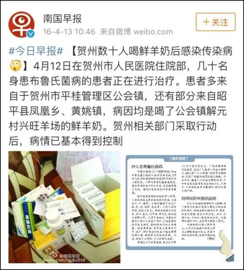 5月17日,澎湃新闻报道,广东省紫金县发生了一宗布鲁氏菌病疫情,39人被送进医院救治!经调查,疫情原因是村户饮用了未经有效消毒的散装鲜羊奶!