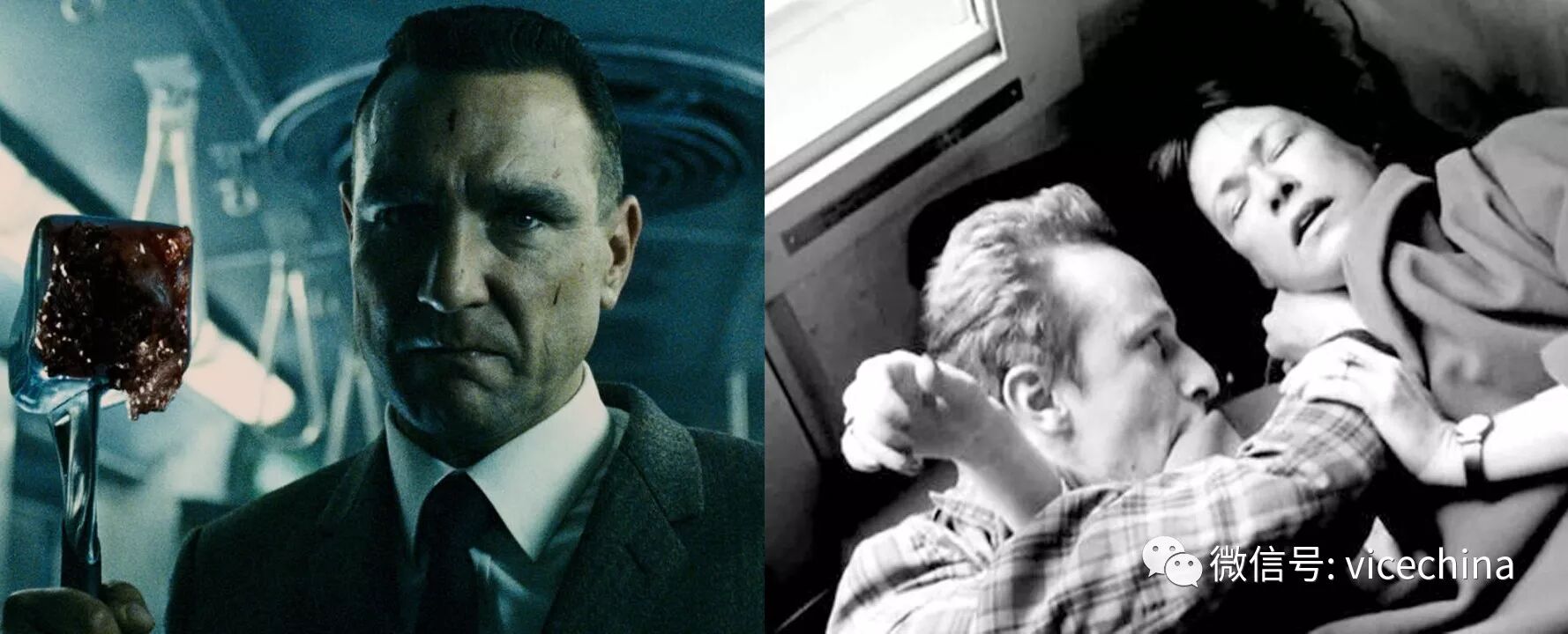 ∆ 惊世骇俗的黑色电影 《人咬狗》 中的列车杀人场景 (左) ;恐怖片 《午夜食人列车》 也发生在子夜的列车上 (右)