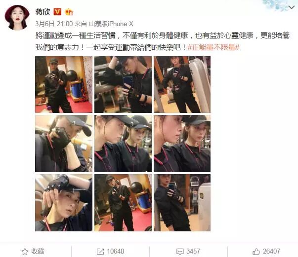 都说每逢佳节胖三斤,可蒋欣貌似并不是。这不,她在微博晒了一组健身九宫格。